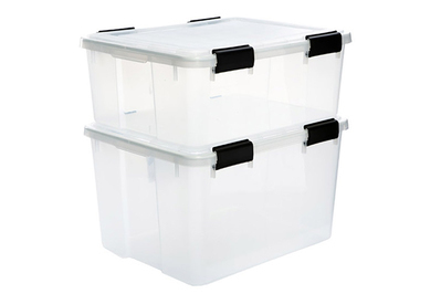 After testing 32 bins by dropping them, soaking them with a garden hose, and hauling them around stuffed to the brim, we concluded that the Iris Clear Watertight Tote is the best water- and impact-resistant storage bin.